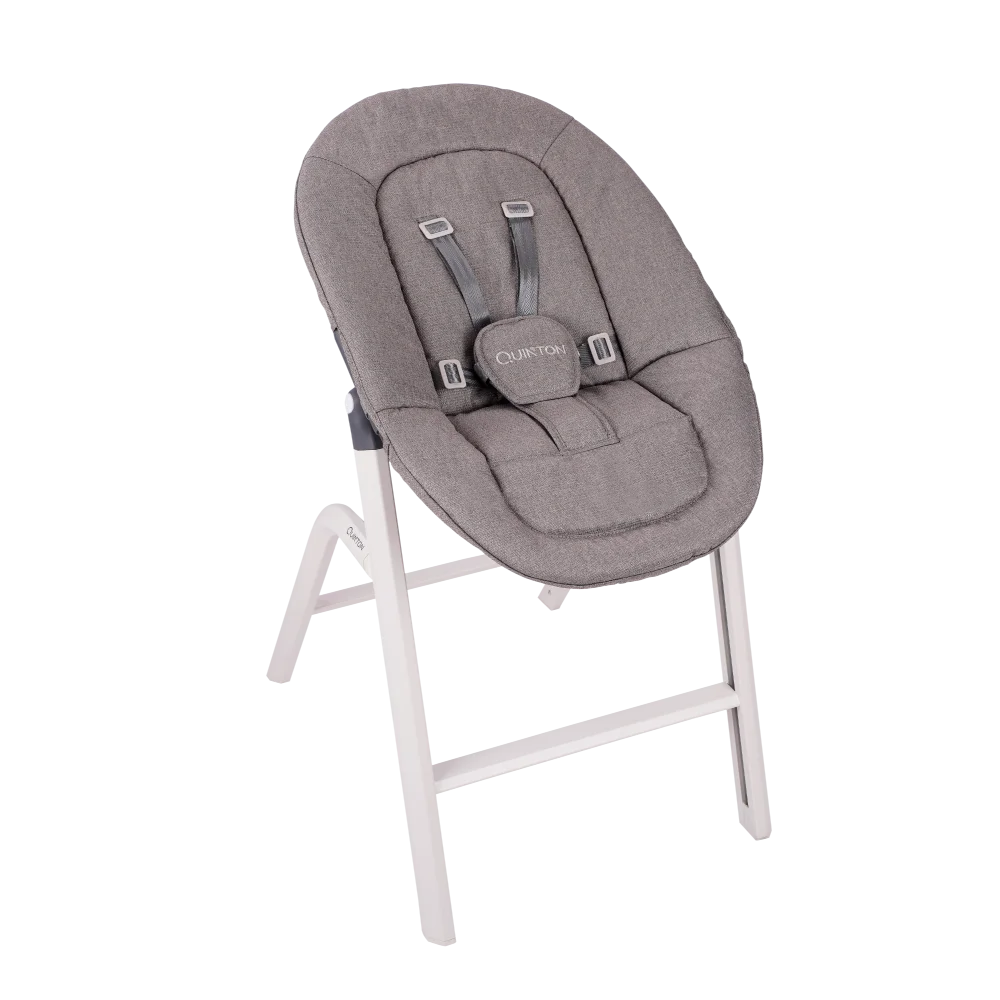 Use standalone from birth or click onto a compatible Quinton high chair base. A 5-point harness with soft pads keeps baby secure; two recline positions with ergonomic leg support for rest and play. Supports newborns up to 9 kg. High chair base is sold separately.